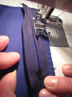 Vetoketjun toinen puoli ommellaan kiinni, vetoketjun oikea puoli kankaan oikealle puolelle.