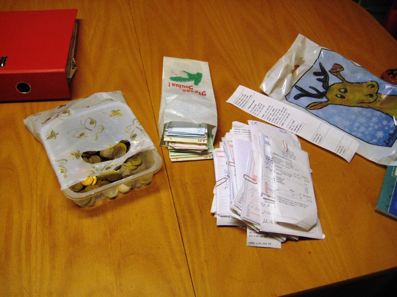 Tänään on edessä työ, jota inhoan. Osan siitä kävin jo putiikissa tekemässä. Laitoin joulukuun kuitit järjestykseen. Meillähän kirjoitetaan jokainen kuitti käsin ja se kyllä on työlästä, mutta huvittaa aika monia asiakkaita. Pankkikorttikuittien ja käteiskuittien täsmääminen ja kirjaaminen ei ole vahvoja puoliani. Yleensä alan tätä työtä tehdä kesken työpäivän ja senhän tietää millainen show siitä tulee, kun välillä tulee asiakkaita ja loppupäivästä kaikki on yhdessä kaaoksessa.
