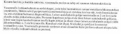 Viisasta on teksti, mutta tarkoittaako se hyvää vai pahaa? Haluaisin uskoa hyvää, mutta pahat aavistukset täyttävät ajatukseni. Tuo ”luisen a:n pohja vasemmalla on 2cm levyiseltä alueelta puhki” kuulostaa pahaenteiseltä. Ja tuokin ”proteesin kuppiosan pohja ei ole tässä …pohjassa kiinni vaan ….kupin ja ohuen ohuen luisen….väliin jää enimmillään n.2 cm levyinen tila”. Hui kamalaa!