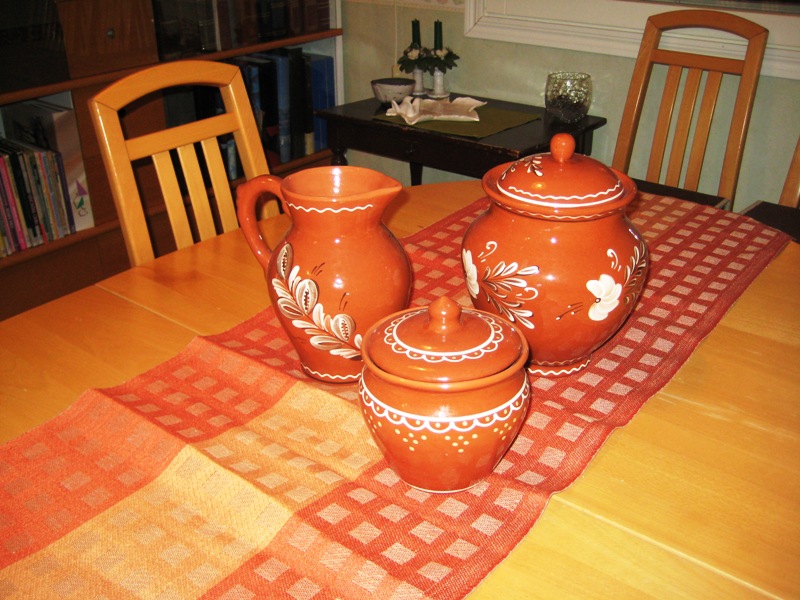 Somistin myös ruokailuhuoneen pöydän. Joululiina pois ja toinen tilalle. Nämä keramiikkakulhot ojennettiin minulle lahjana käydessäni Venäjällä pienessä Mujejärven kylässä. Tyypillistä sikäläistä käsityötä – vai onkohan sittenkin teollisesti valmistettu, en tiedä?