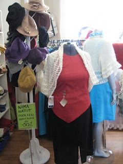 Ensin kuvia ”asustehuoneesta”, jossa on esillä pellavatunikat, hatut, villasukat, shaalit jne…. Näyteikkunalla esiintyy vanha mallinukke, jonka kädet olemme ehkä laittaneet väärin, senverran hankalalta asennolta näyttää.