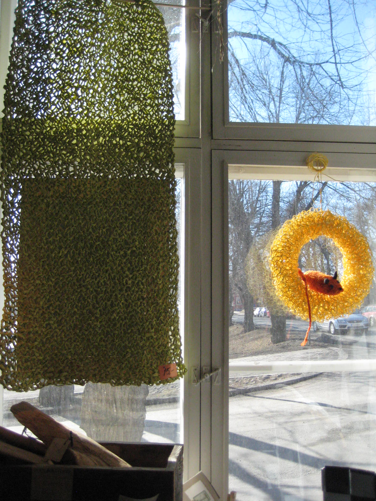 Tänäänkin myyntityö keskittyi meillä molemmilla käsityötarvikkeisiin ja neuvomiseen. Valmiiden tuotteiden myynti on hyvin vähäistä. Yksi, mitä usein kysytään – tänäänkin – on lahja, jonka saa postitettua kirjekuoressa. Asiakas ei löytänyt mieleistään, mutta se saattoi johtua siitäkin, että hän on meidän ideat jo käyttänyt aikaisemmin.