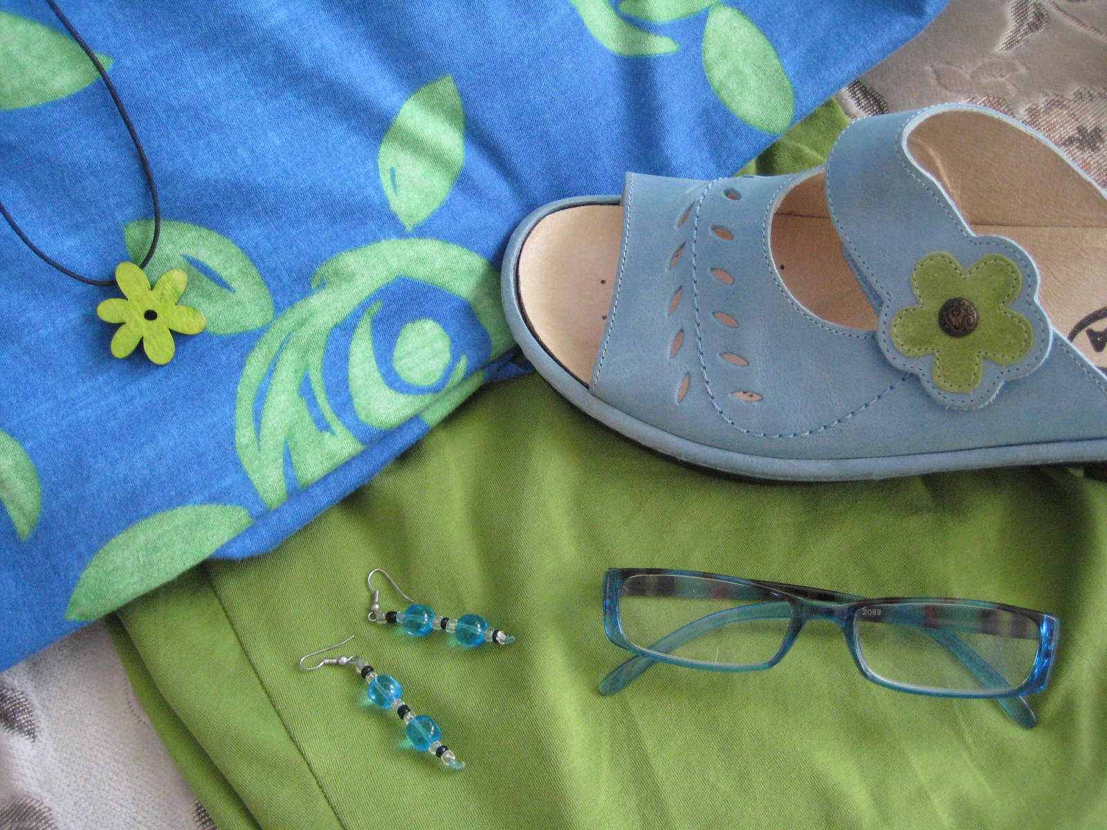 Tässä uusin asuni. Housut yksinään ovat aika hurjan väriset, mutta kun muut asusteet on valittu niihin sopimaan, niin menettelevät. Nämä asusteet mätsäävätkin aika hyvin, vaikka kaikki on kerätty ”mitä kaapista löytyy” – tyylillä.