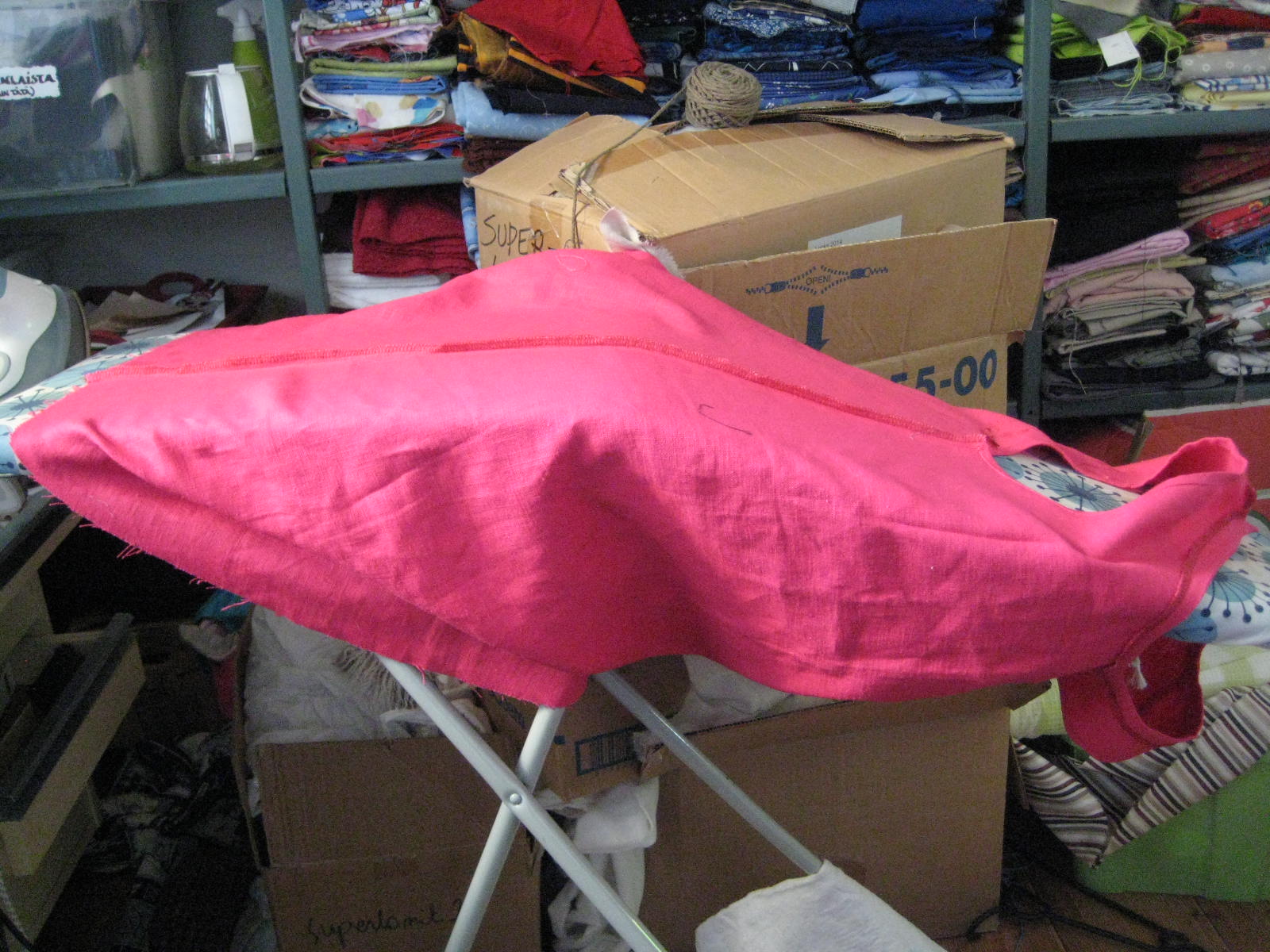 Painava pahvilaatikko putosi (lue: minä pudotin) korkealta hyllyn päältä ja osui tähän murtaen laudan. Mutta katsokaas, miten ihanan värinen pellavamekko! Livenä ehkä vieläkin räiskyvämpi fuksia.