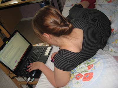Kamera on taas jossain tavaravuorien alla, joten uusia kuvia ei tule ennen suursiivousta, nyt siis mennään vanhoilla kuvilla. Tässä tyttäreni kesälomallaan – ehkä tekee verkkokauppaa, ehkä jotain muuta? Aina kuitenkin tuossa asennossa. Paitsi tällä viikolla, kun aloitti kesätyöt turkulaisen firman talous-hallinnon tehtävissä.
