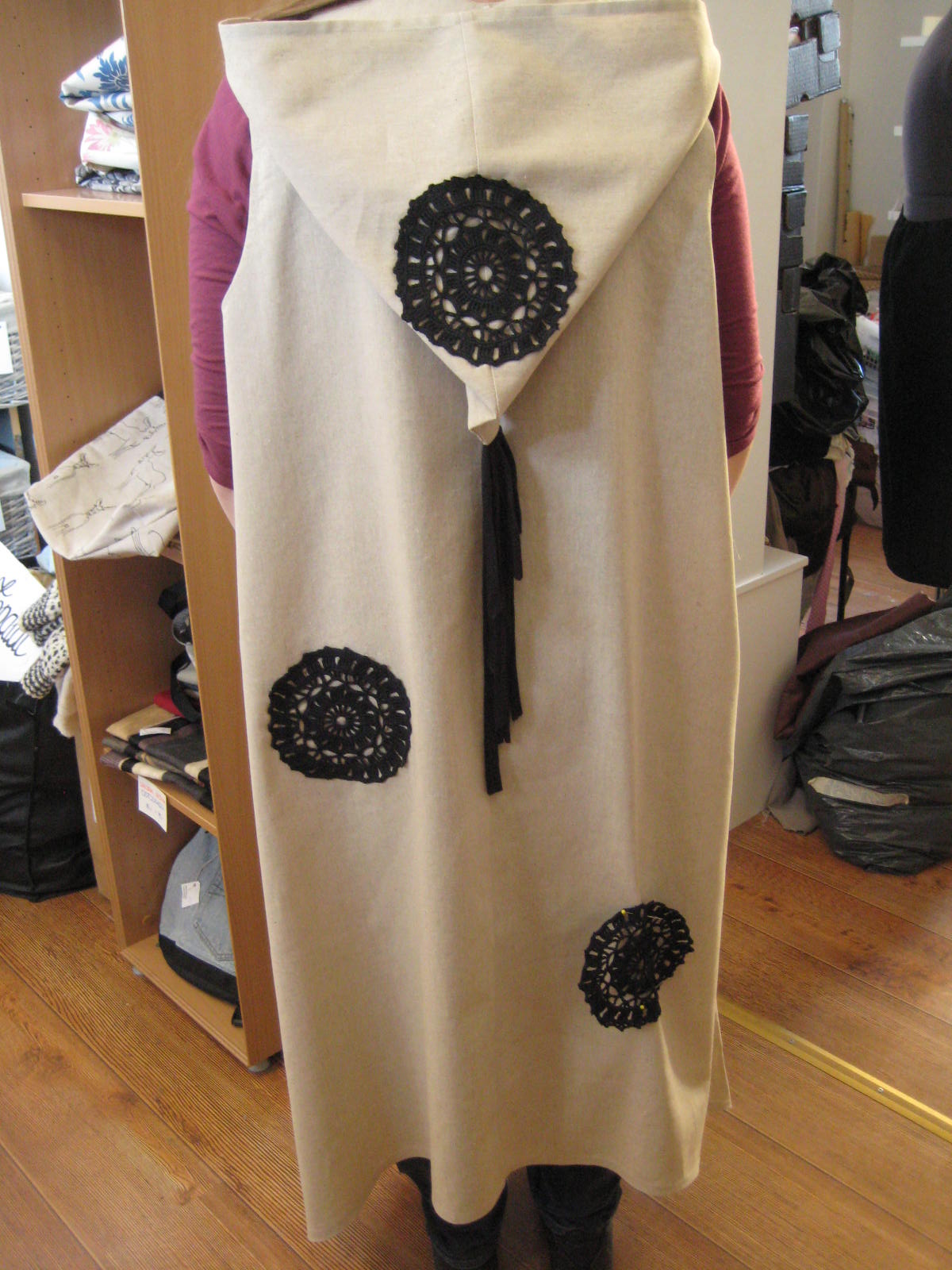 Materiaaliksi varmistui ohuehko pellava/viskoosi-kangas. Tämän mekon tein kiireessä muotinäytöstä varten. Toinen tunika valmistui tilaustyönä, mutta siitä ei ole muuta kuvaa kuin tämä taskuista otettu.