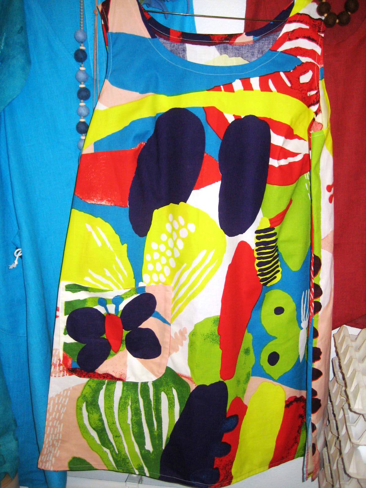 Tässä vielä kuva toisesta tilausmekosta. Asiakkaalle tehtiin jo yksi Pellavasydämen pellavatunika, mutta toinen tehtiin hänen omasta kankaastaan. Tämä on Marimekon Ötökkä-kangasta. Odottaessaan valmiina tämä kirjava mekko keräsi kovasti huomiota ja moni olisi ollut siitä kiinnostunut. Marimekon kankaisia minä en tokikaan voi valmistaa myyntiin, mutta ehkä kannattaisi jotain tuollaisia kirjavia puuvillamekkoja tehdä? Tykkäätkö sinä tällaisesta?