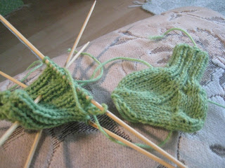Asiakas tilasi vanhalle pehmoapinalle pienet villasukat, pituus 5 cm. Väriehdotus oli oranssi, muttei sellaista lankaa löytynyt varastoistani, joten päätin tehdä vihreät. Yhden sukan tekemiseen meni koko Selviytyjät- ohjelma. Eli tunti. Mikäs se onkaan minimituntipalkka? 10 euroa ehkä. Kaksi sukkaa siis 2 x 20 + alv 24% = 24,80 euroa. Eikä tuossa hinnassa ole vielä huomioitu muita kuluja. Mutta, eihän me naiset nyt sellaisia hintoja. ”Ihan vaan huvikseni telkkaria katsellessa kudon.” Niin kudonkin.