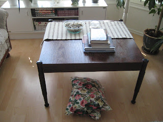 Tällainen sohvapöytä meillä on nyt – ja on ollut 35 vuotta. Joku varmaan kaikkein halvin vaihtoehto 70-luvulla. Kyllä minä tästäkin tykkään, mutta kun tiedän että se on niin out of season… Mutta mitenkäs minä tuon korkean pöydän sovitan tähän paikkaan? Pöydän jokaisesta jalasta näkee, että sitä on ehkä jossain vaiheessa aiottu madaltaa. Siihen en kyllä haluaisi ryhtyä.