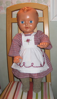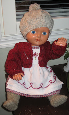 Muutama vuosi sitten toinen vanhempi rouva toi alastoman nukkensa minulle vaatetettavaksi. Hänellä oli kuulemma iso nukkekokoelma ja nyt hän halusi tälle isokokoiselle nukelle sodanaikaiset vaatteet. Olipa se kiva projekti – aikaavievä kylläkin. Tutkin netistä ja kirjastosta 40-luvun tyttöjen vaatetuksia ja tein kaikki alusvaatteista lähtien mahdollisimman autenttisiksi. Sukkanauhatkin muistan värkänneeni. Hmm…mahtaako nukesta otettu valokuva olla jossain tallessa?