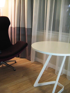 Tämän kuvan otin pohtiakseni myöhemmin, että olisiko tuollainen kaksiosainen verho kiva kotonakin? Pöytä ainakin näyttää hauskalta.