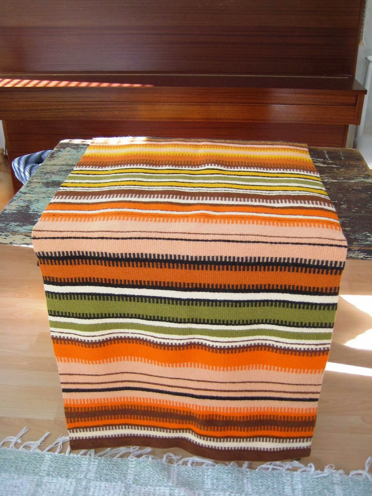 Asiakas toi tällaisen raanun Pellavasydämen keinutuolin matoksi. Se ei kuitenkaan ollut käytössä hyvä, joten on jäänyt piiloon pöydän alle.Näin syksyn kynnyksellä tämä näyttää väriensä puolesta oikein ajankohtaiselta. Minun ajatukseni tämä taitaa kylläkin viedä 70-luvulle…