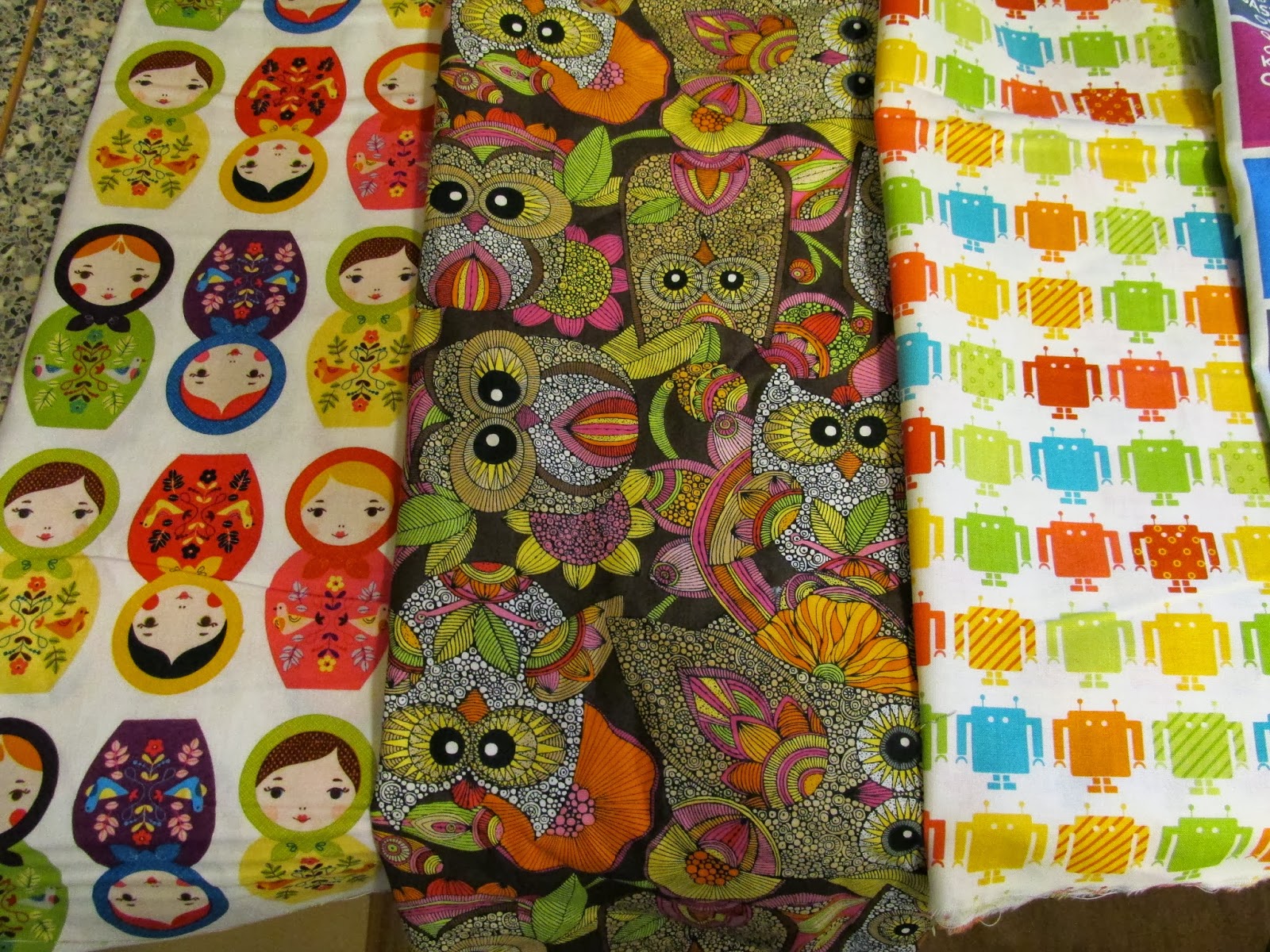Näitä kaikkia voit halutessasi saada sinäkin. Hinta on 18 euroa metrille ja kangas on 112 cm leveää. Kaikki muut ovat puuvillaa, paitsi tuo turkoosi leppäkerttu-kangas on pehmoista, kapeavakoista samettia. Vielä jäi kaksi ihanuutta kuvaamatta. Ne ovat fleecen tyyppistä kangasta ja niin söpöä että.