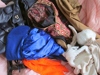 Tämän päivän olen lähes tulkoon viettänyt kirppareilla. Autossa onkin aika hyvä saalis, monen monta pussukkaa täynnänsä vaatteita. Kun materiaali maksaa vaan muutaman euron, voi ostella varuiksi, vaikka en aivan varma olekaan, jos sopii päälle tai sopii rooliin.