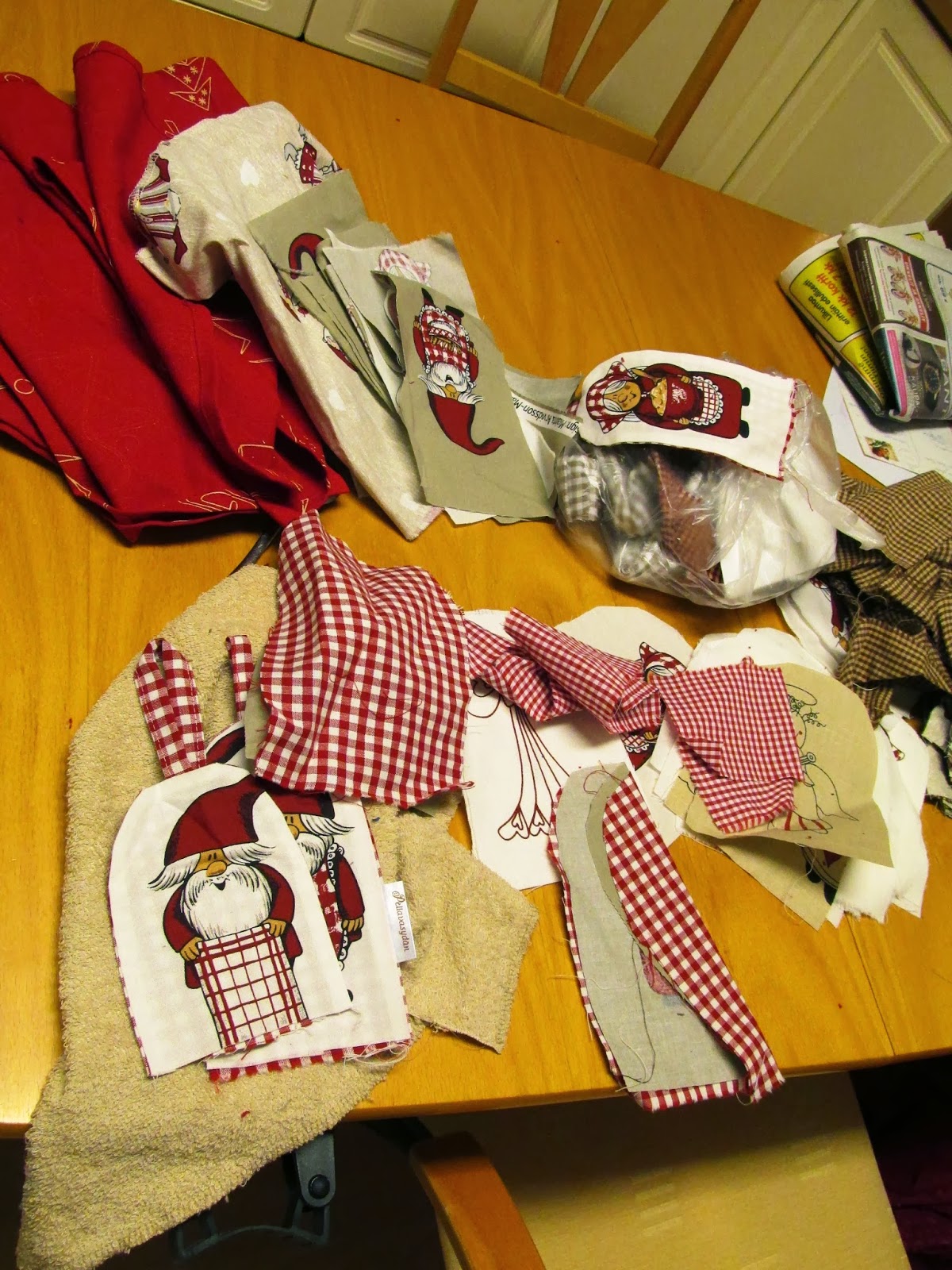 Putiikin työhuoneen hyllyjä tyhjentäessäni löysin keskeneräisiä jouluisia töitä. Päätin tehdä nämä loppuun. Näppipyyhkeet myytiinkin jo kaikki, joten huomenna vien putiikkiin täydennystä.