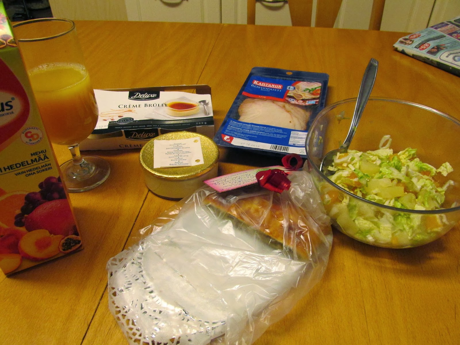 Tuoremehua, myyjäisistä ostettua lihapiirakkaa, kaali-ananas-salaattia, kinkkuleikettä, creme brulé – niitä taisin syödä kolme tuollaista pikkupurkillista. Oletteko maistaneet? Se on niin niin niin ihanaa….