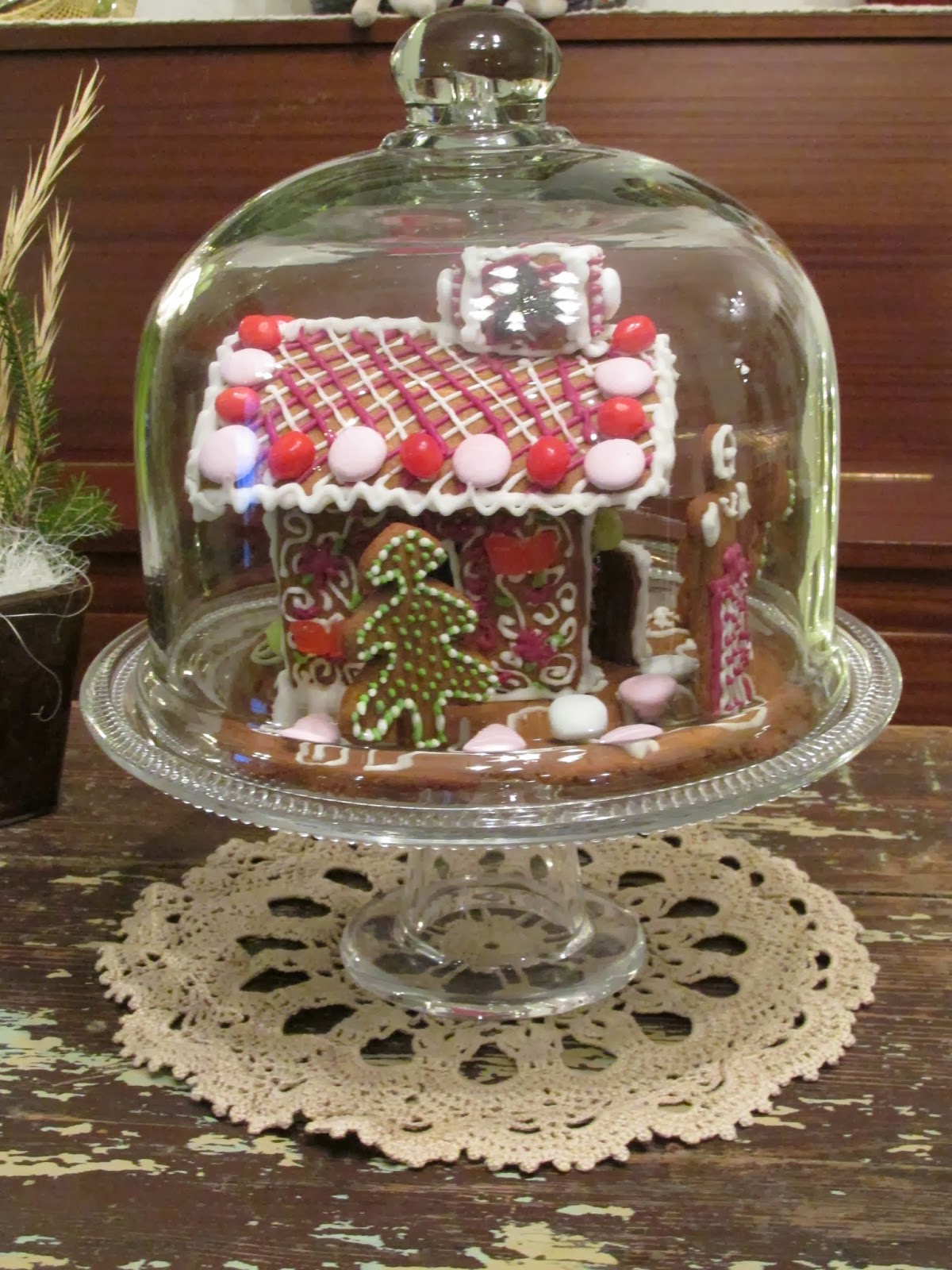 Joka vuosi Mirvan piparkakkutalot kaunistuvat. Nyt siitä tuli oikein onnistunut. Ja varsinkin, kun sille on vielä kauan odotetut puitteet – lasikuvun alla se näyttää niin nätiltä että!