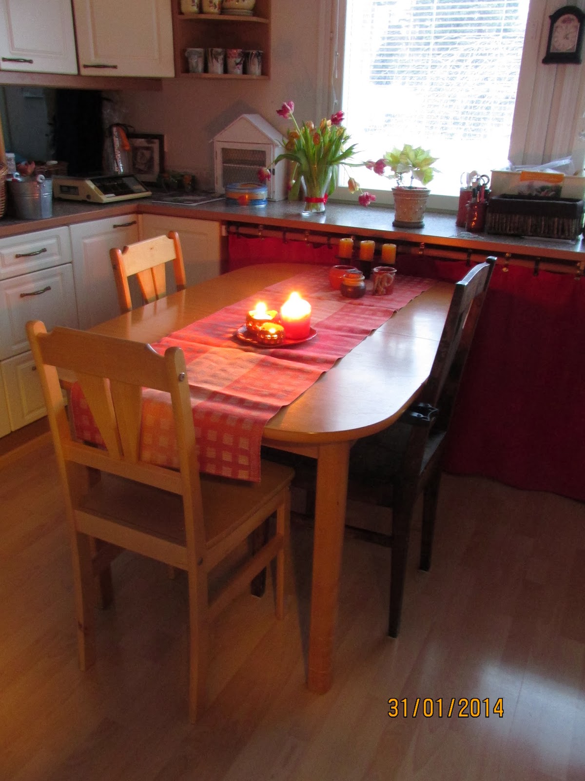 Haluaisin pitää pöydällä pöytäliinaa, mutta mutta…. Nyt olen jo pitkään miettinyt sellaista vaihtoehtoa, että hankkisin tuon pöydän päälle paksun lasilevyn. Sen alla voisi pitää vaikka miten hienoa pellavaliinaa, eikä se menisi likaiseksi.
