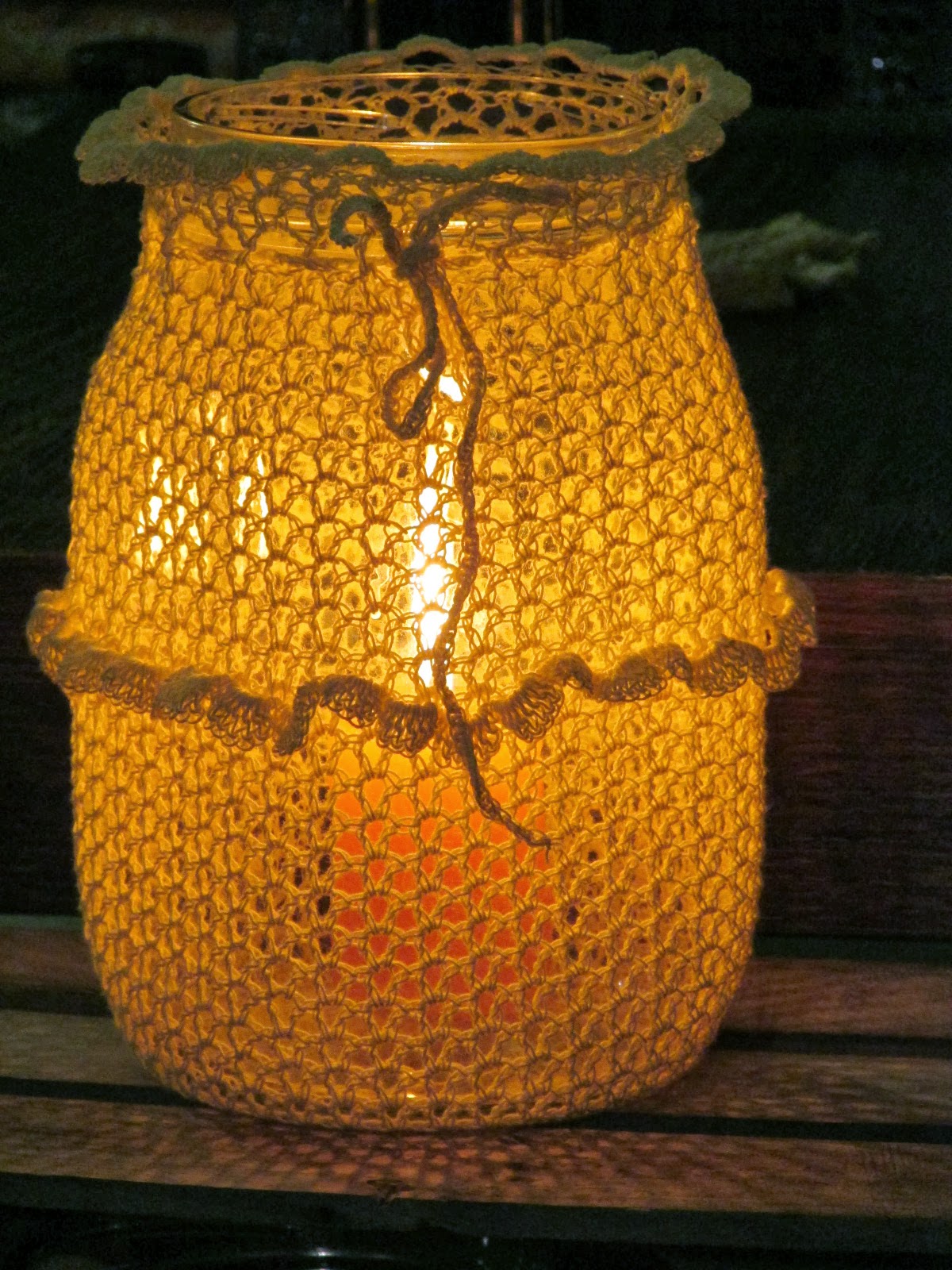 Ja tähän purkkiin tein hiukan kellertävästä kalalangasta päällisen. Erittäin yksinkertaisella mallivirkkauksella – ettei tarvitse silmukoita laskea… tulipa kaunis lyhty!