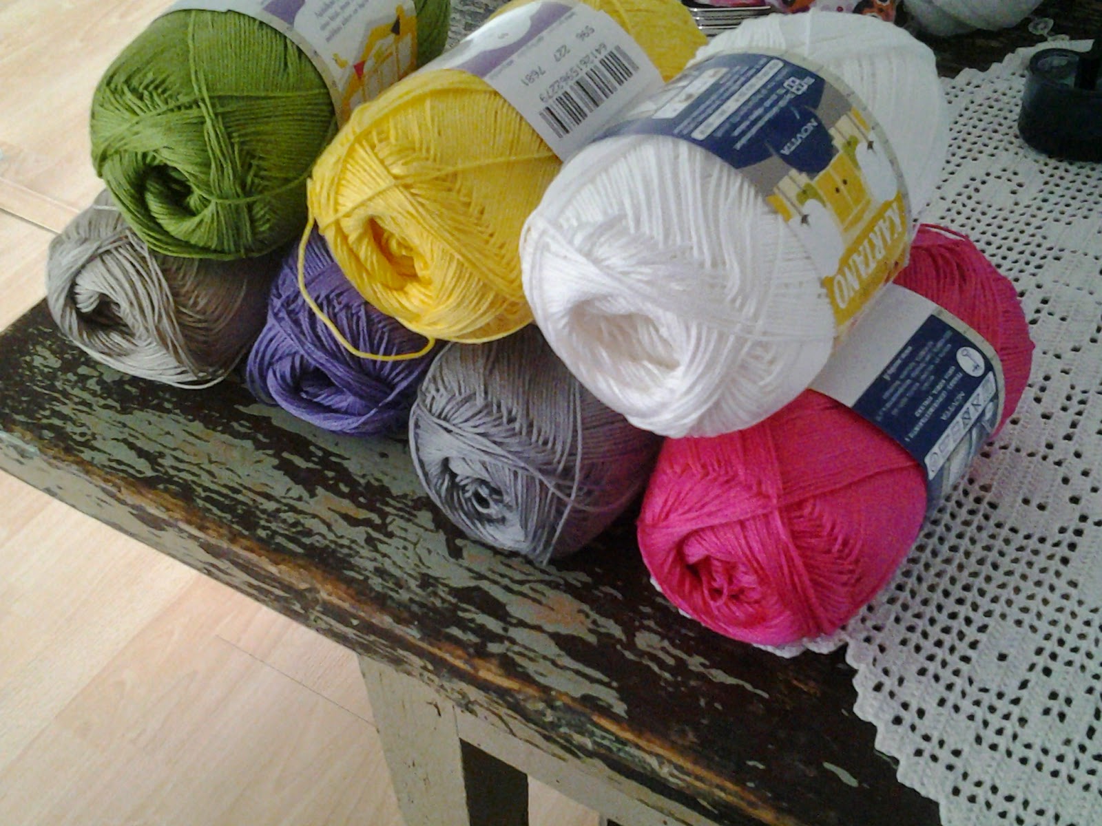 Olen nyt joka tapauksessa miettinyt vaatetustani. Suunnittelen virkkaavani valkoisen ohuen, lyhythihaisen jakun. Kun en kauppoihin pääse, soittelin kaikki mahdolliset lankaa myyvät liikkeet Ugissa, mutta yhdestäkään ei löytynyt valkoista virkkauslankaa. Tilasin siis suoraan Novitalta. Entinen Kotiväki-lanka on nykyisin Kartanoa ja virkkauslanka-niminen taitaa olla kokonaan lopetettu. Tilasin kaikkia 7 väriä kilon, eli yhteensä 7 kiloa.