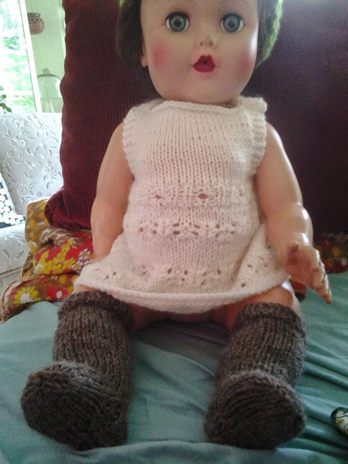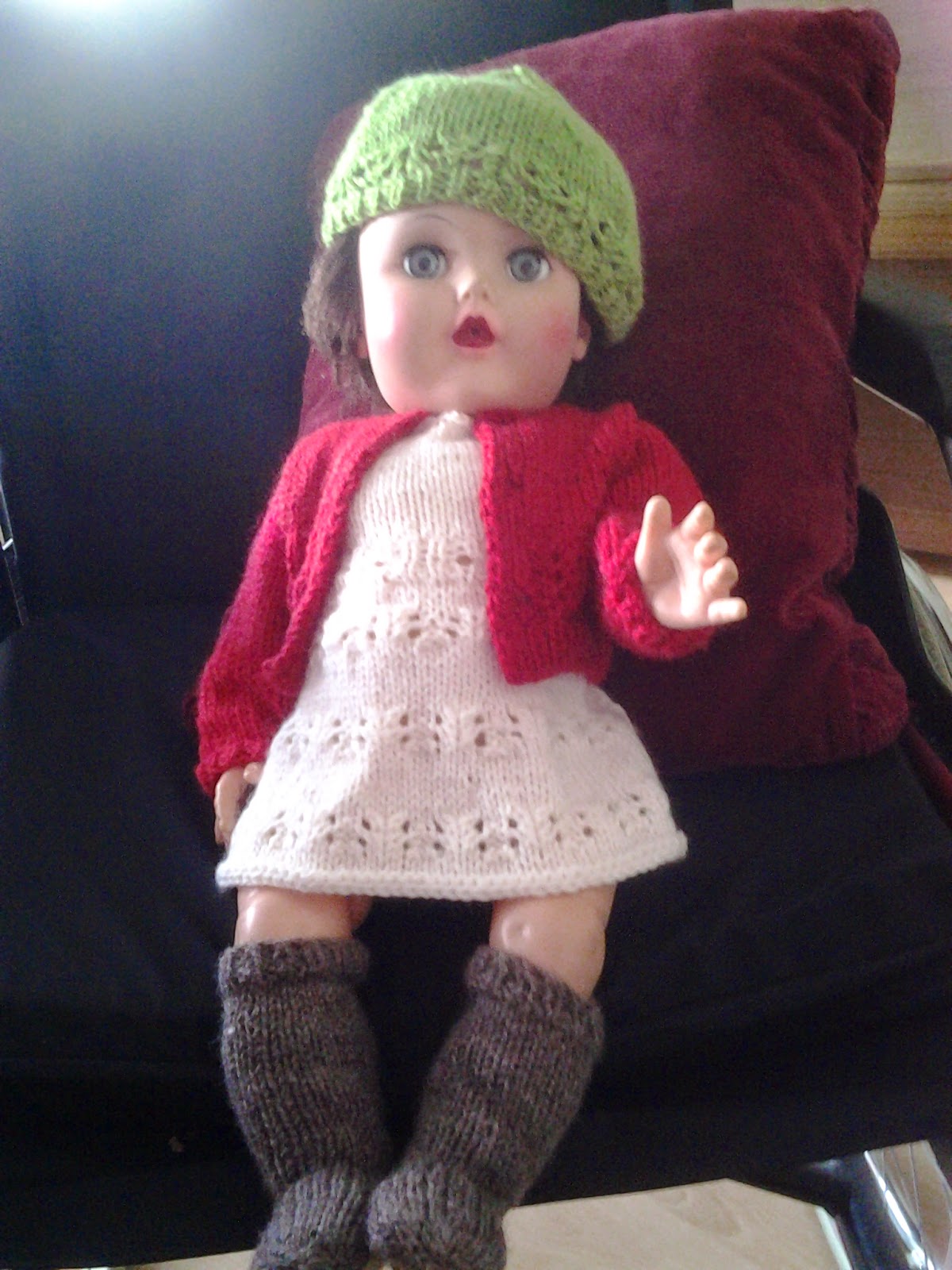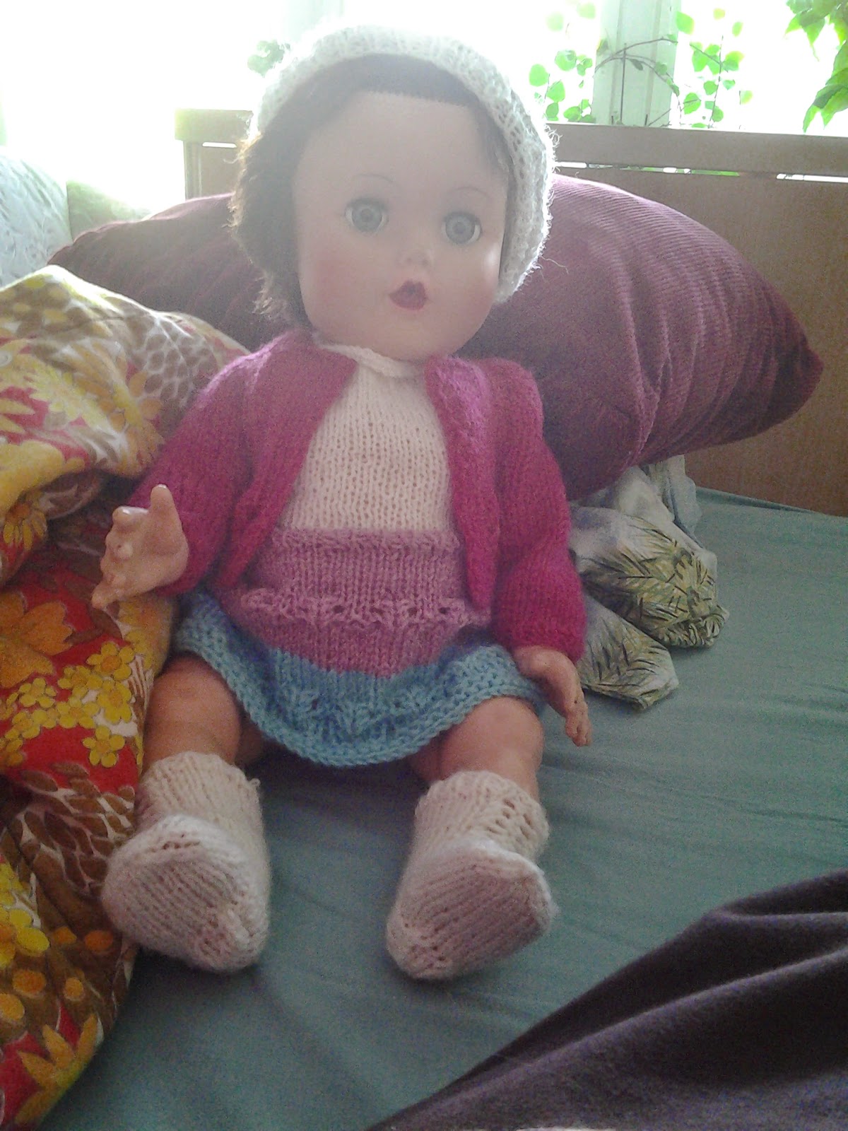 Vähän tuntuu hassulta vääntää nukenvaatteita, mutta mukavampi sekin, kuin olla kädet toimettomina. Tällaisen työn hinnoittelu on muuten aivan mahdotonta. Aikaahan näihin menee vaikka kuinka paljon, mutta kuka maksaa? Olimme keskiviikkona iltatorilla ja siellä oli juuri tämän kokoinen nukke neulottu asu päällään ja hinta oli 50 euroa!
