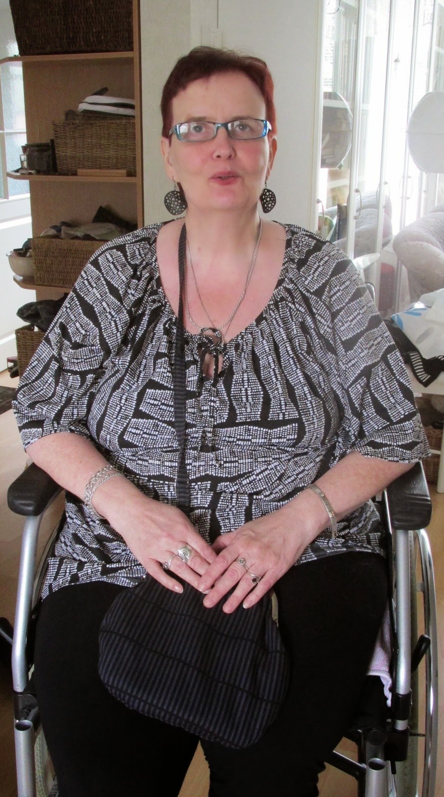 Huomaa korvikset, joista olen kirjoittanut jo aiemmin. Ne ovat Nousevan Myrskyn Liisan pyöränkumista valmistamat. Tuotakin voisin ”mainostaa”, yliolan laukkuani. Se ei ole Marimekon, vaikka kangas kovasti sellaista muistuttaakin. Ihan vaan torilta ostettu ja niin kätevä pyörätuolissa istuessa.
