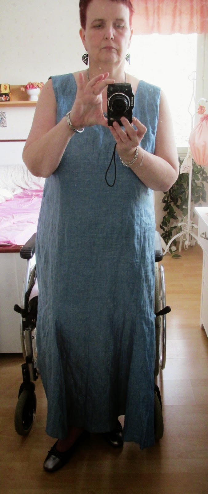 Olen aiemminkin kehunut, miten onnistuneita ostoksia teen facebookin vaatekirppiksillä. Ja nyt taas. Olen saanut jo useamman mieluisan paketin tässä viime viikkojen kuluessa. Totuushan on, etten olisi yhtään uutta vaatetta tarvinnut, mutta onpa ensi kesää varten. Tässä kuvassa ylläni on pellavainen kotelomekko, joka olisi ollut oikein mainio valinta myös häihin.