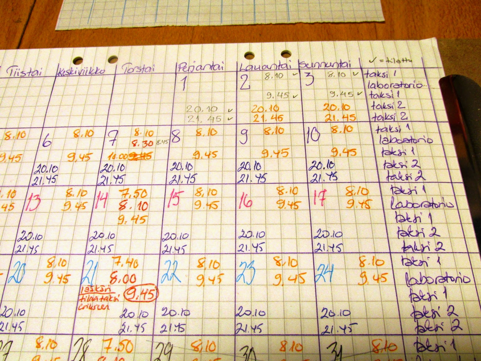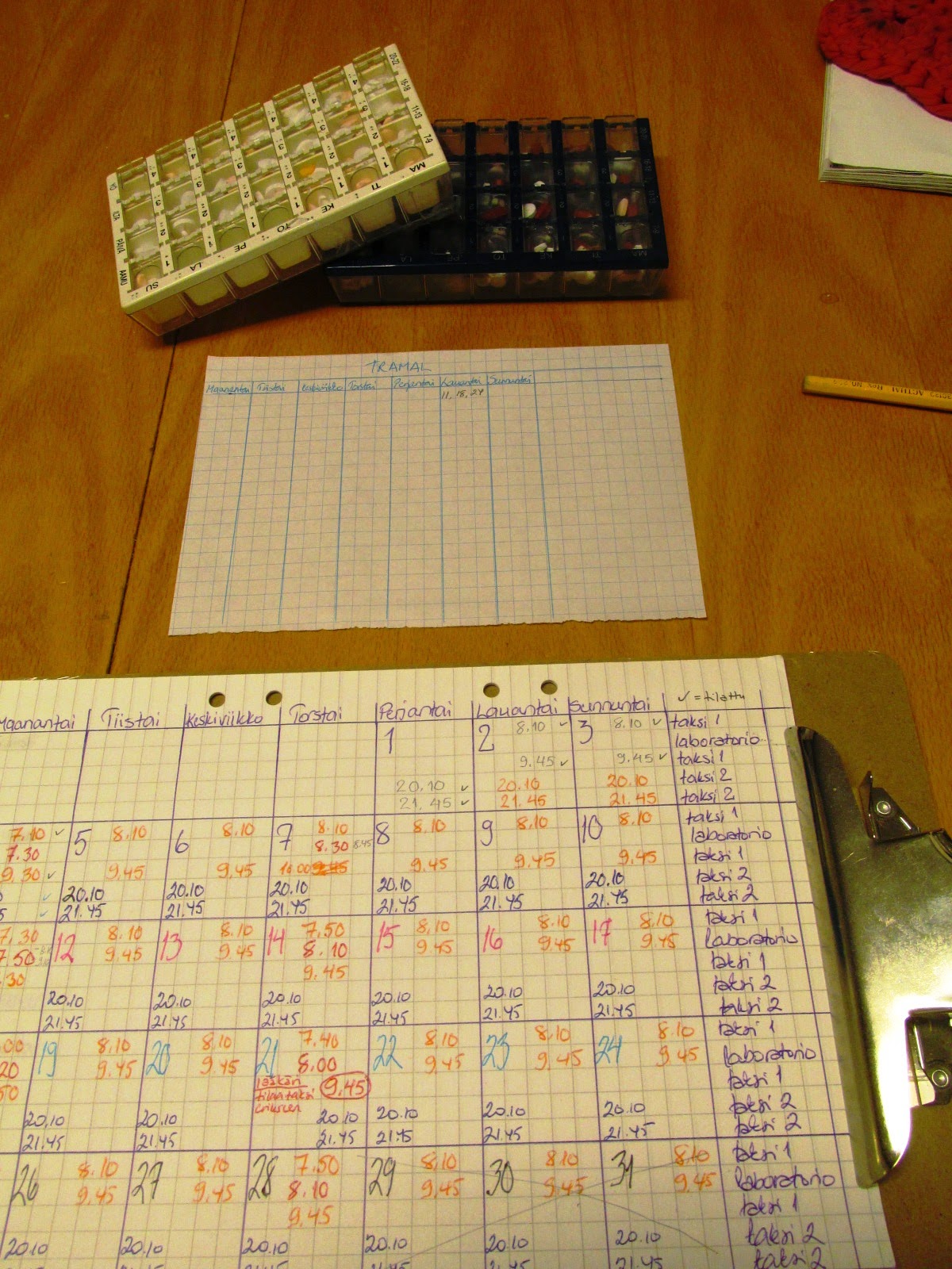 Näillä apuvälineillä pysyn päiväjärjestyksessä. Miten otetaan lääkkeet ja vielä erikseen Tramalin ajoitus sekä hieno taulukko, josta löytyy taksin saapuminen ja se onko taksi jo tilattu sekä laboratorioajat.
