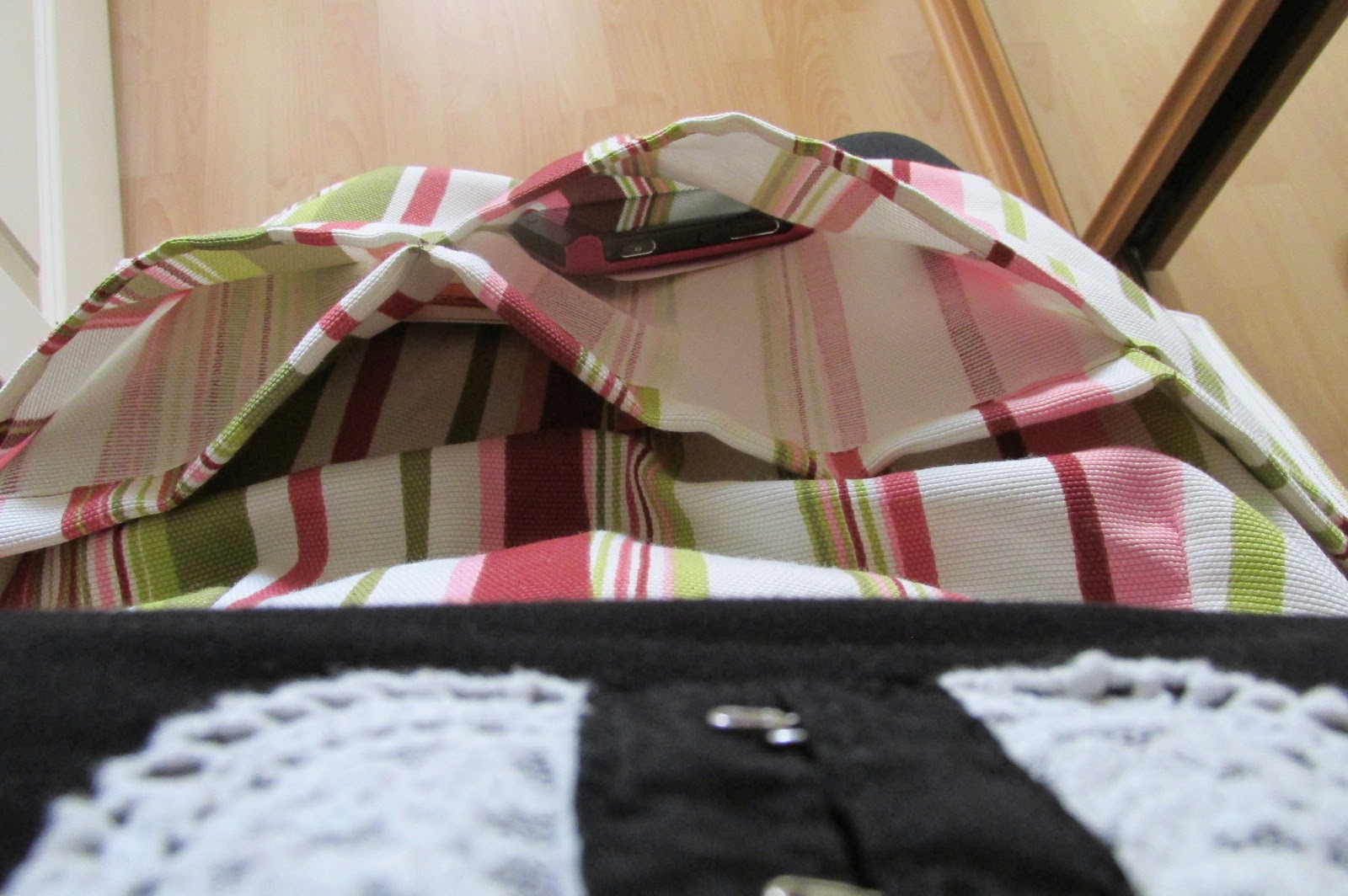 Taskusta tuli tuollainen koko essun levyinen ja kaksinkertainen. Päällimmäinen osa on jaettu kolmeen osaan.