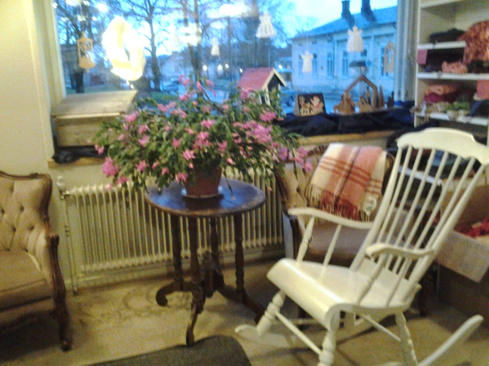 Tänään tuli taas uusi avustaja. Melkein joka kerta onkin eri. Kotona hän imuroi ja pyyhki pölyt. Viikonloppusiivous tehty siis. Kävimme ostamassa silityslaudan. En millään selviä kauppareissusta, enkä varsinkaan silityslaudan kuljettamisesta. Avustaja on siis erittäin tarpeellinen. Putiikissa oli tavoitteena saada näyteikkuna valmiiksi ja sen me myös teimme. Sunnuntaina on joulukadun avajaiset ja se on hyvä deadline.