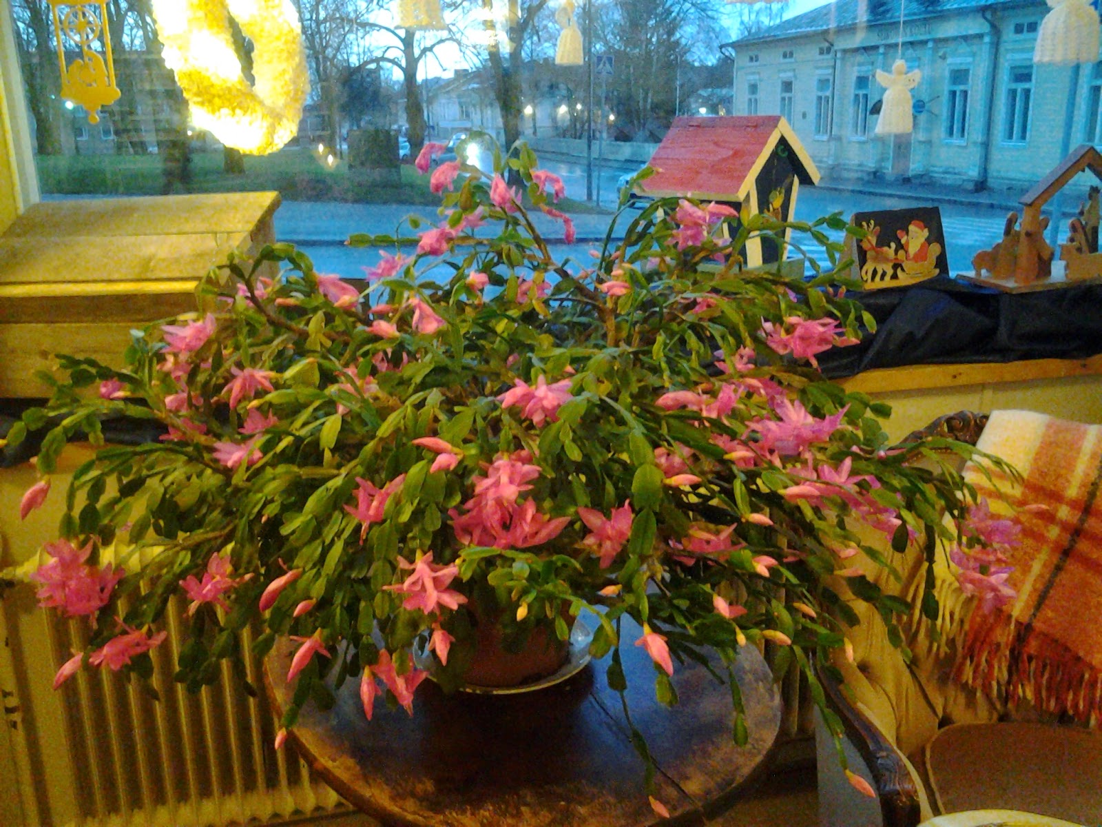 Joulukaktus on herättänyt ansaitsemaansa huomiota. Se on ollut – kuten aina ennenkin – kesän puskien alla. Syksyllä mieheni toi sen Koulukadulle ja nyt siirsi viileästä tuohon ikkunalle. On se upea!