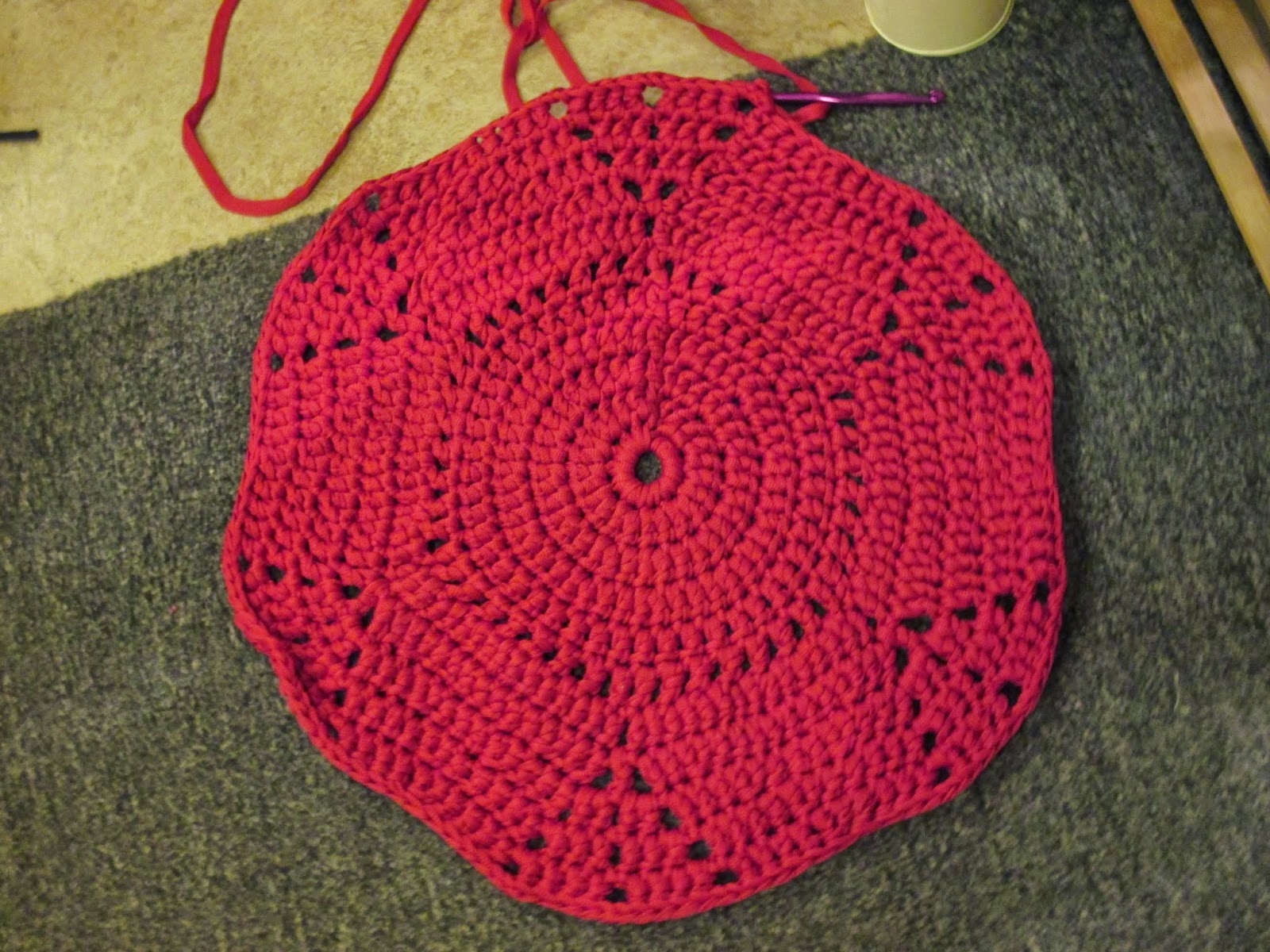 Aika moni asiakas on käynyt hakemassa ontelokudetta maton virkkaamiseen. Lopulta innostuin itsekin. Olen tehnyt mattoja vain trikookuteesta, mutta nyt aloitin Esterikuteesta. Valitsin punaisen, kun tilasin sitä jouluksi turhankin paljon. Ja sopiihan tuo väri mainiosti meidän uuteen harmaaseen kotiin. Vessan matoksi vaikka.