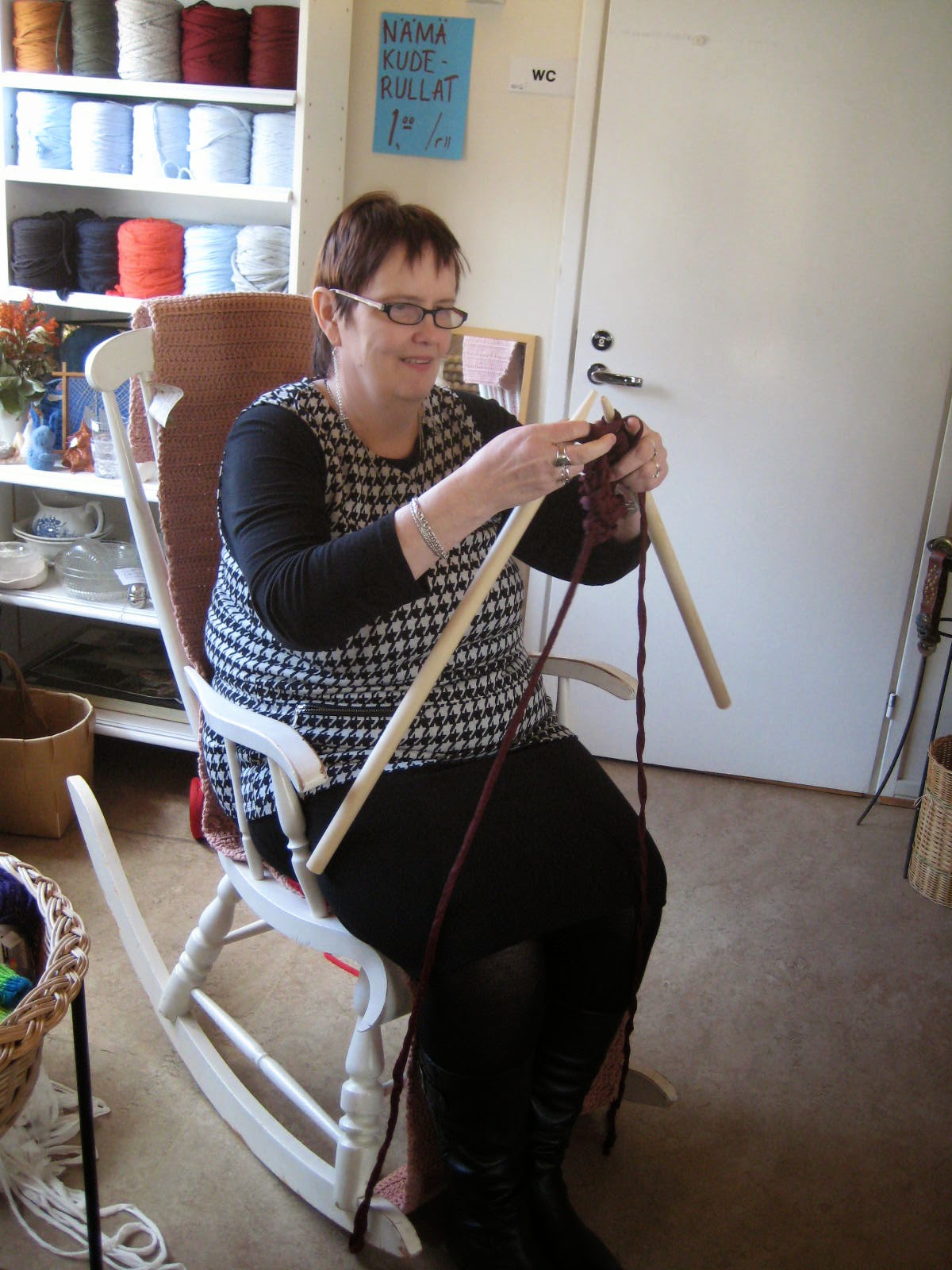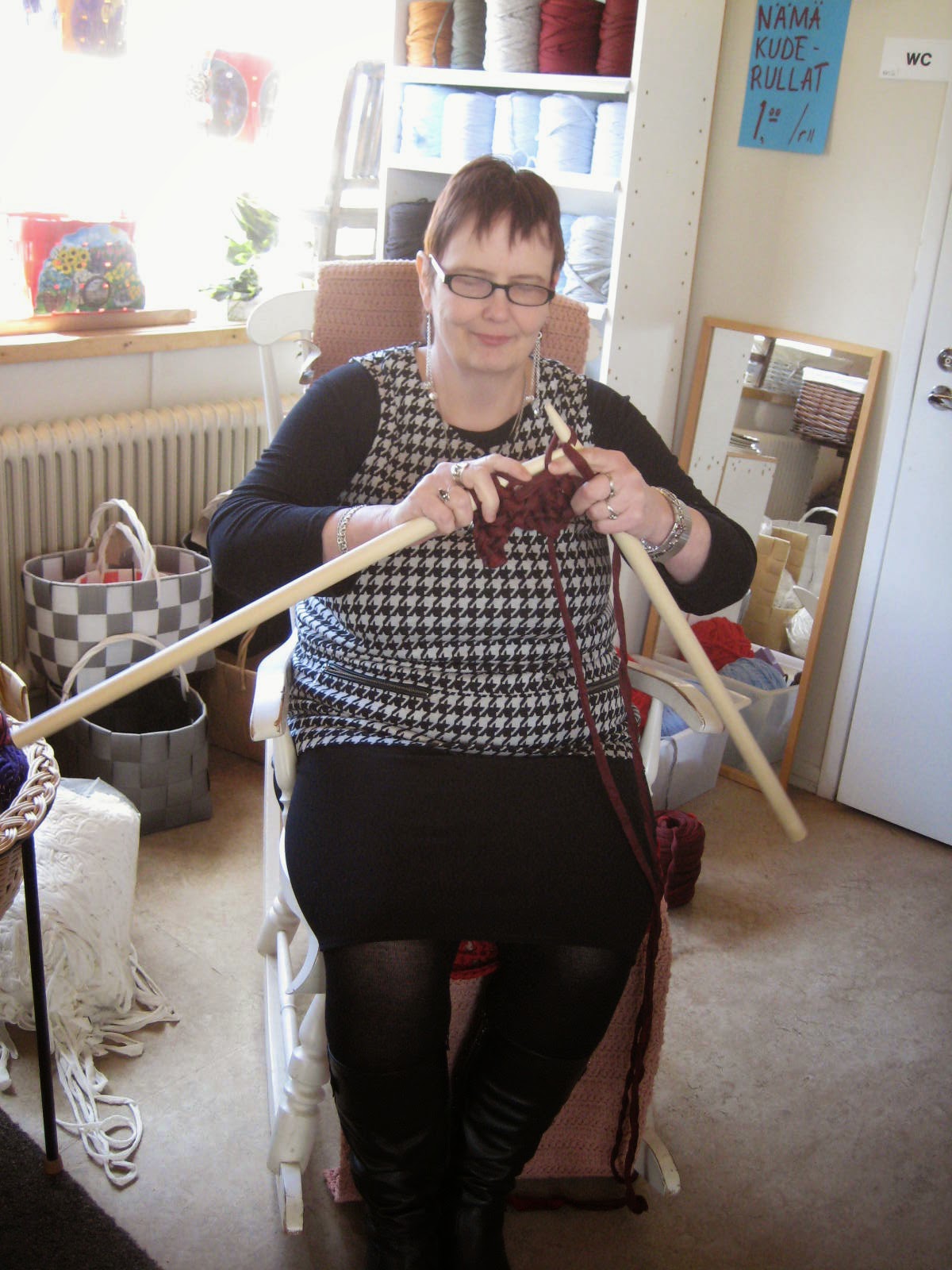 Ja tässä on varsinainen työ. Aika raskasta neulomista – pakko pitää puikkoa lattiassa kiinni, kun ei käsivoimat riitä…. Lopputulos ei ole vielä valmis, näytän sitten kun on.