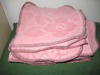 Toinen vaaleanpunainen idea on alla. Ikivanha hiutunut kylpypyyhe veteli viimeisiään, mutta pihinä ihmisenä en tietenkään voinut sitä poiskaan heittää. Tein siitä siis 17 pesurättiä. Saumurilla vaan reunat ympäriinsä.