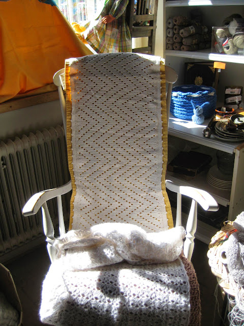 Ensimmäisessä kuvassa keinutuolissa on virkattu hartiahuivi ja tässä alimmassa oikein keinutuoliin tarkoitettu peite. Olen tämän tehnyt aikoinaan omaan kotiin ja olin sitä jo purkamssa alkutekijöihinsä, kun on väärän värinen, mutta onneksi keksin, että tuossahan se hyvin täyttää paikkansa ja ehkä joku saa inspiraation tästä.