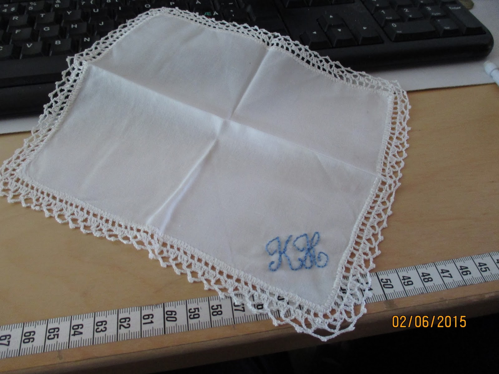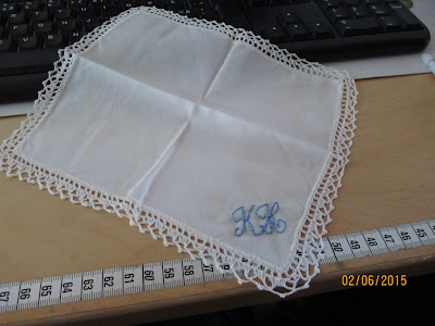 Selaillessani facebook- ryhmiäni, huomasin eräällä (ei käsityö-) sivustolla jonkun kyselevän nenäliinan ompelijoita. Näytin kuvat niistä, mitä Pellavasydämessä oli valmiina. Hän tykästyi yhteen ja pyysi siihen ”jotain sinistä”.