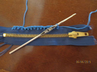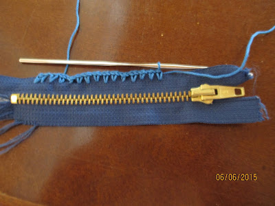 Ja näin se tapahtuu. Otetaan vetoketju. Aletaan virkkaamaan sen reunaa pitkin. Virkkuukoukku siis pistellään vetoketjun kankaan läpi.