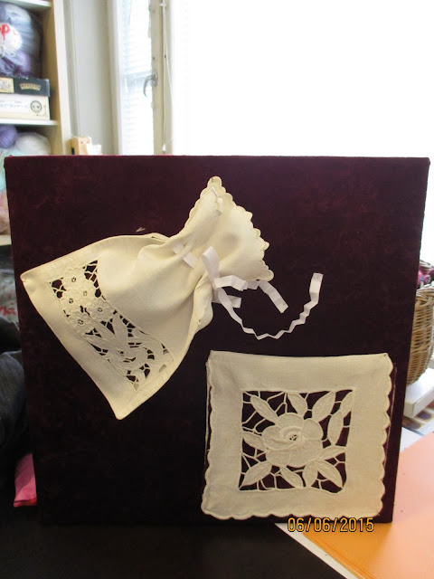 En tiedä, mikä tämä pussukka on, ehkä nenäliinalaukku? Siinä on tasku, mutta se on nimenomaan tuon hienon kirjaillun ”lipareen” takana.