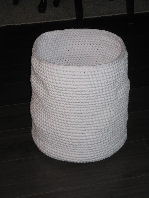 Tilaustyönä valmistui iso sisustuskori. Virkkasin sen rullalla olevasta matonkuteesta. Myyn näitä 5 euroa / rulla ja olen ollut erittäin tyytyväinen. Vaikka tekstiiliteollisuuden jämämateriaalia onkin, näissä kude on kuitenkin suht tasaista. Tämä kori, vaikka onkin aika ohuesta kuteesta, on oikein napakka ja pysyy hyvin kuosissaan. Ei ole vaaraa, että reunat luhistuisivat.