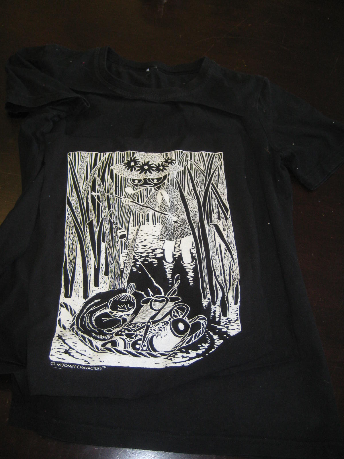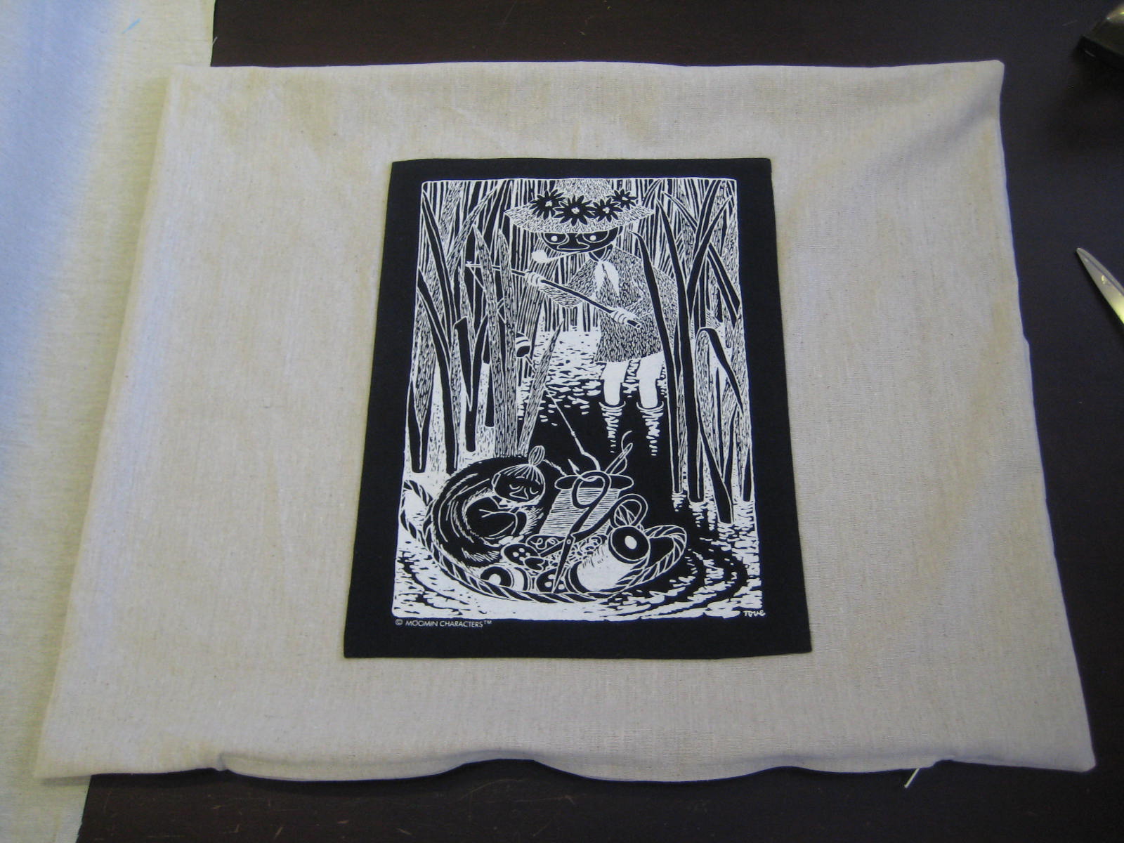Asiakas pyysi siirtämään muumi-kuvan t-paidasta tyynyksi. Taustaksi valitsimme pellavanvärisen pellavakankaan. Tämäkin tilaustyö oli erittäin hyvä opetus. Tällä kertaa opin, miten ei kannata trikoota kiinnittää joustamattomalle kankaalle.