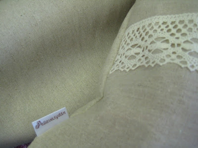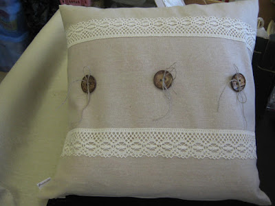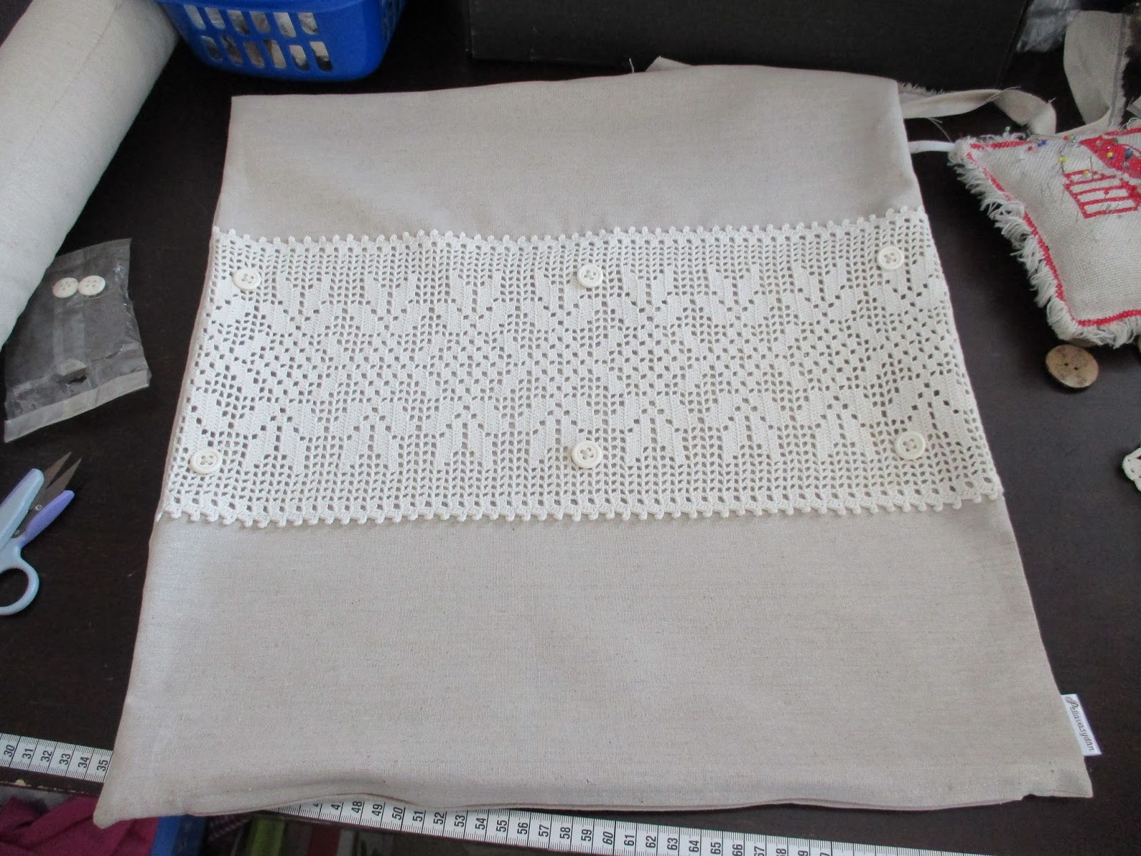 Tässä toisessa tyynynpäällisessä on uudet pitsit ja ihanan ihanat napit, jotka ovat nyörillä kiinni eli ne saa pesun ajaksi pois. Varsin kauniit tyynynpäälliset minun mielestäni. Nyt kun vauhtiin pääsin, tekisin näitä eri versioina vaikka kuinka monta. Ehkä teenkin?