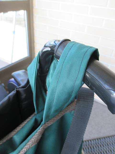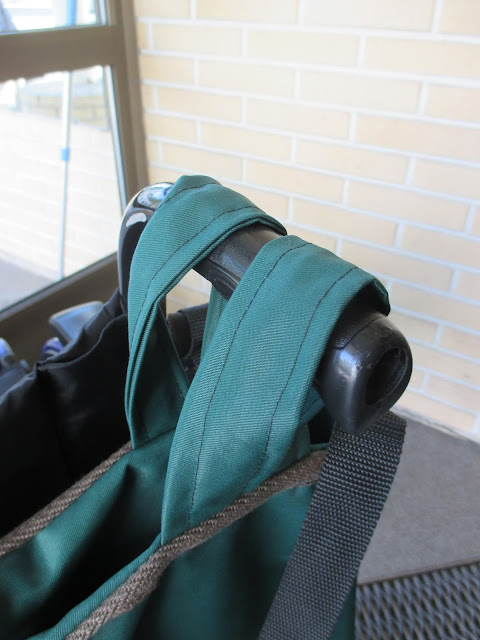 Oleellista tässä kassissa on kahvat, joista se ripustetaan pyörätuolin työntöaisoihin. Ompelin niitä neljä, jotta kassi ei jää repsottamaan.