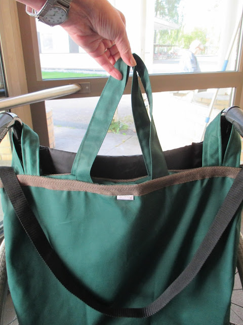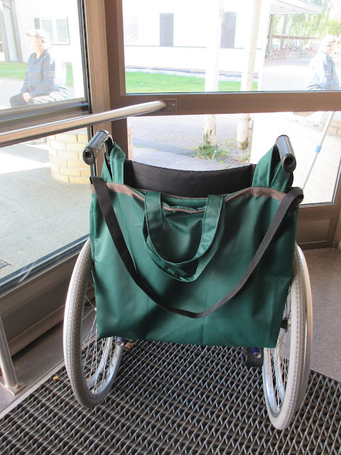Koska minulla ei tällä hetkellä ole käytössä pyörätuolia, kävin terveyskeskuksen aulassa testaamassa ja kuvaamassa kassin. Aivan kerrassaan mainiosti näyttää passaavan.