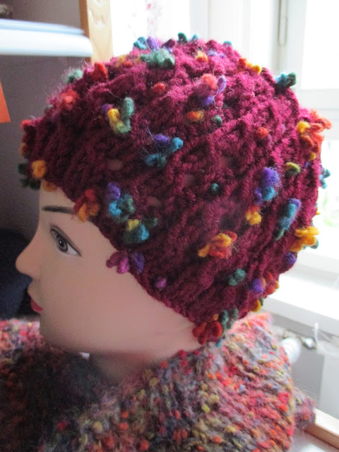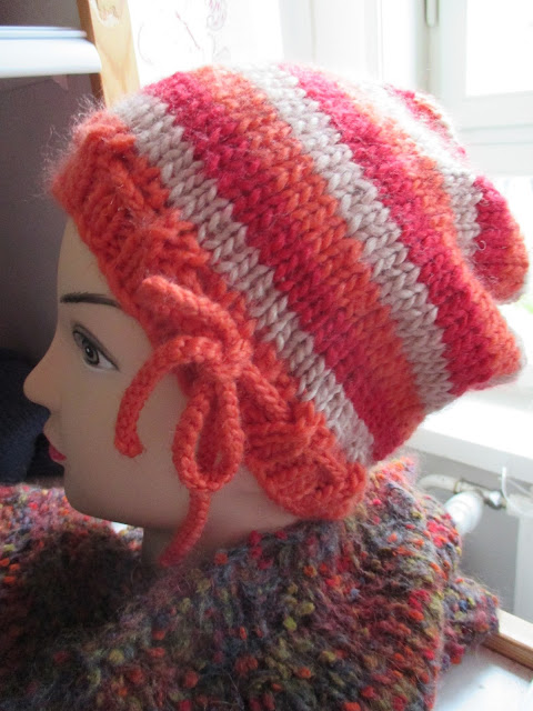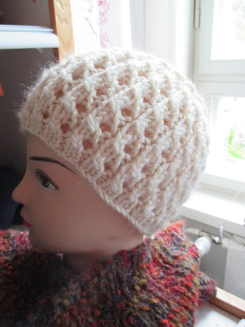Tässä näkyy hassusti mallin päänahka läpi. Lanka on oikein ihastuttava Katian Peru. Tekisi niin mieli tehdä tästä langasta joku villatakki. Tässä minun oma mallini, jolla teen nykyisin lähes kaikki pipot. Ohje vaan on edelleen viimeistä silausta vaille. Aina vaan pitää tarkistaa, että onko se nyt oikein. Alla sama malli.