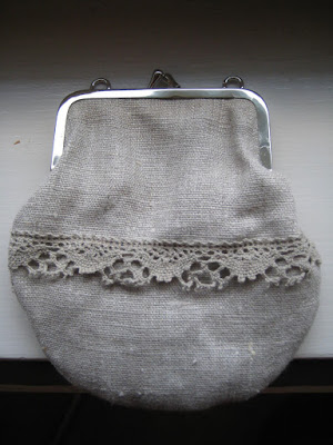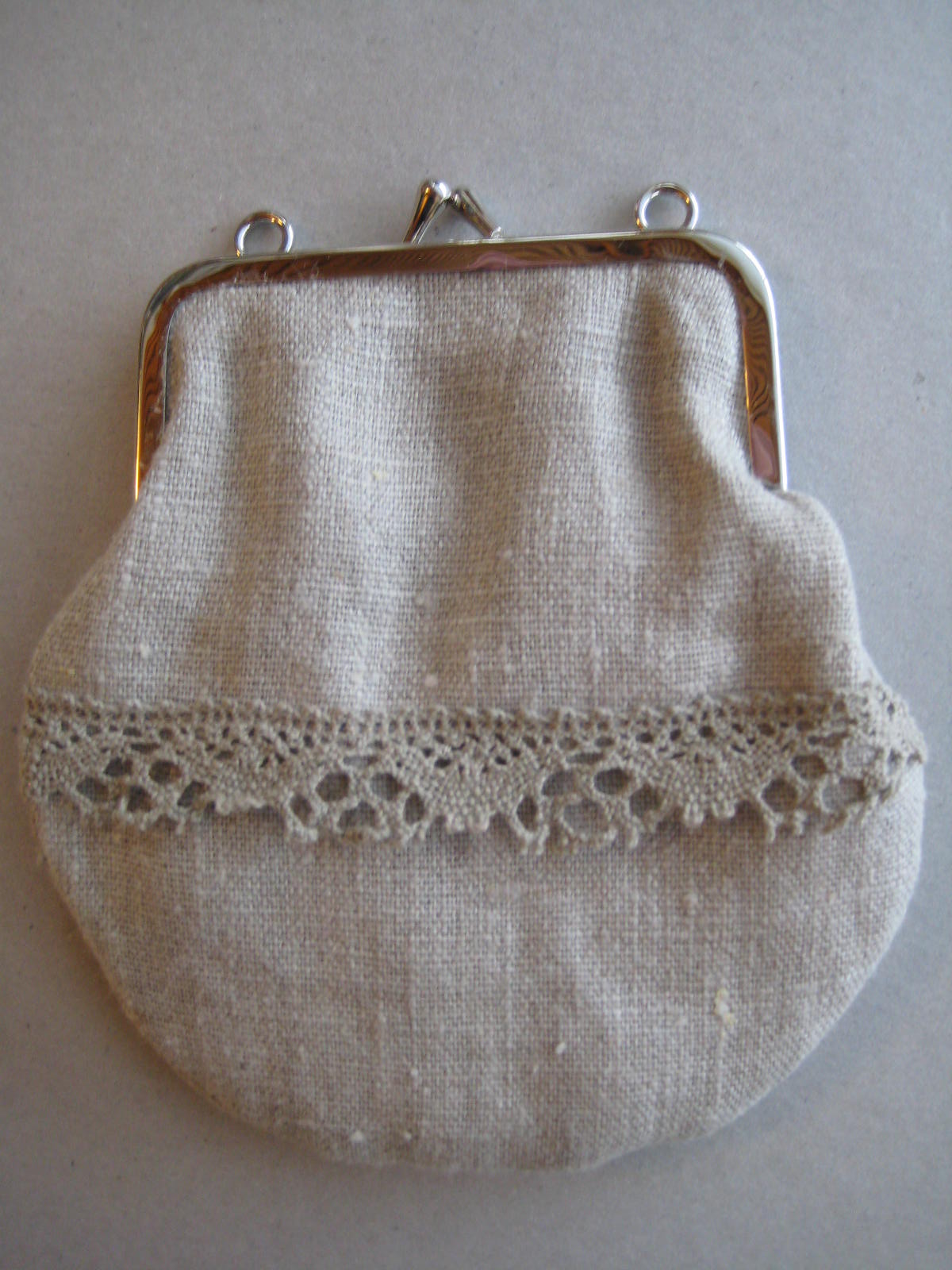 Alapuolella olevassa pellavapussukassa on sensijaan kehys, jossa on kunnon kiinnityslenkit hihnalle. Se on nyt vielä vähän mietinnässä, että laitanko ketjun vai ompelenko hihnan samasta pellavakankaasta. Tähän saattaa tulla vielä joku nappikin koristeeksi.