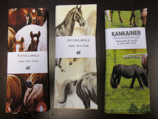 Nämäkin kangaspalat olivat kyllä aika hintavia (verrattuna hintaan, jonka maksan tukkuliikkeelle) mutta kun en tarvitse kuin pienet palat. Näistä tulee – toivottavasti – joulumyyntiin kehyskukkaroita heppahulluille. Kankainen myy myös tutun näköisiä kankaita.