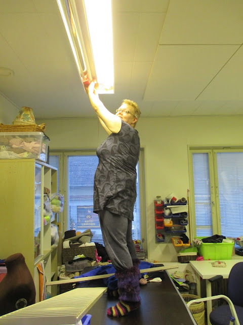 Tänään huomasimme yhden loistevaloputken sammuneen. Kata kysyi, missä niitä on ja minä kerroin ko. varaston. Vähän ajan päästä lamppu oli paikallaan. Näytti siltä, että on muuten ennenkin tuontyyppisiä hommia hoitanut! Niin kiva mulle.