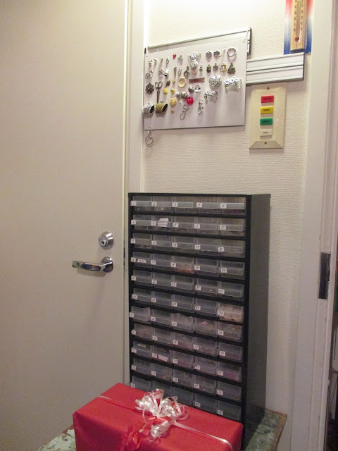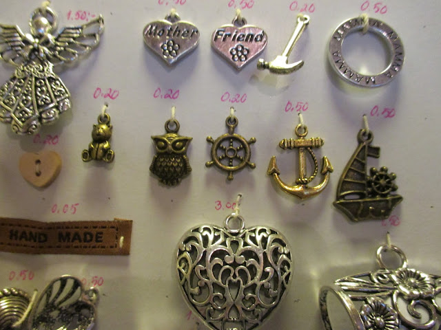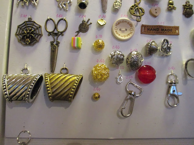 Jo useamman vuoden meillä on ollut ongelmana pienten korutarvikkeiden esillesaaminen. Eikä ne ole mennyt kaupaksi, kun ei kukaan näe niitä… Nyt ei ole enää ongelmaa. Kata ompeli jokaisesta mallin hintatietoineen pahville. Pahvin alapuolella on lokerikko, jossa tavarat on laatikoissaan.