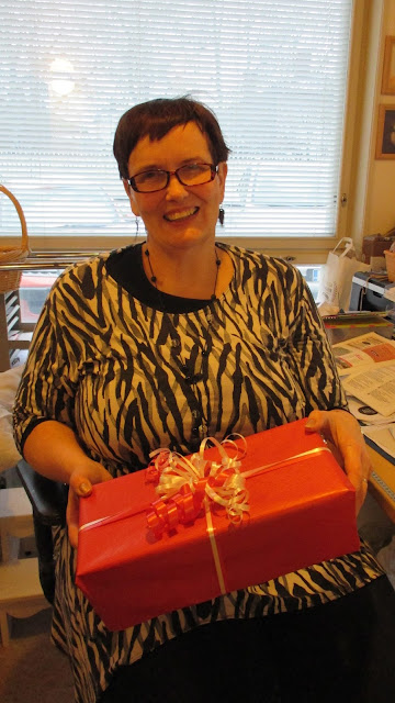 Tuosta paketista Kata oli täpinöissään; hän kun tykkää paketoinnista. Sitähän meillä kyllä saa tehdä. Mitä kivamman ja persoonallisemman paketin asiakas saa, sitä tyytyväisempänä hän lähtee. Piti ottaa kuva myös minusta sen paketin kanssa. On muuten paljon rajattu pois tästä kuvasta, joka otettiin työhuoneessani työpöytäni ääressä. Vaikka realisti olenkin, ihan kaikkea ei voi näyttää.