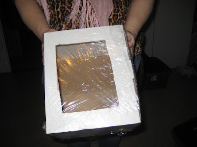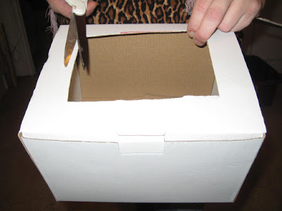 Otetaan pahvilaatikko, tehdään pohjaan reikä ja päällystetään kokonaan elmukelmulla.